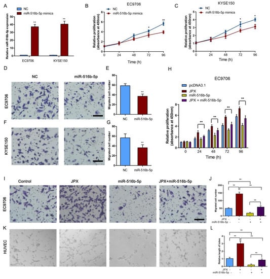 3.5. MiR-516b-5p Abolished JPX-Promoted ESCC Growth and Mobility In Vitro