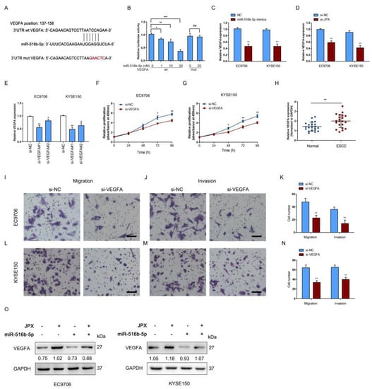He Y, Hua R, Yang Y, Li B, Guo X, Li Z. LncRNA JPX Promotes Esophageal Squamous Cell Carcinoma Progression by Targeting miR-516b-5p/VEGFA Axis. Cancers. 2022; 14(11):2713. https://doi.org/10.3390/cancers14112713