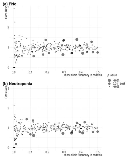 Scatter plot of p-values associated with 313 single variants in the breast cancer polygenic risk score in (a) FNc: febrile neutropenia from initiation of chemotherapy treatment (using taxanes or anthracyclines) to 30 days from last chemotherapy treatment cycle (i.e., within 30 days of last chemotherapy treatment); (b) neutropenia. Fisher’s exact test was used to estimate the associations.