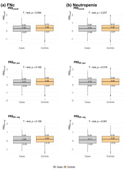 Distribution of 313-SNP breast cancer polygenic risk score (overall, estrogen receptor (ER)-positive, ER-negative) among breast cancer patients with neutropenia-related outcomes and non-neutropenia controls. Controls were chemotherapy-treated breast cancer patients who did not develop neutropenia. Median scores and quartile scores are displayed. A two-sample t-test was used for comparisons of medians; p-values are displayed. (a) FNc: febrile neutropenia from initiation of chemotherapy treatment (using taxanes or anthracyclines) to 30 days from last chemotherapy treatment cycle (i.e., within 30 days of last chemotherapy treatment); (b) neutropenia. PRS: polygenic risk score; PRSoverall: overall PRS; ER: estrogen receptor; PRSER-pos: ER-positive PRS; PRSER-neg: ER-negative PRS.
