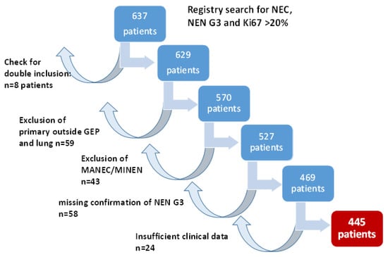 Query of the German NET Registry database for “NEN G3”, Ki67 > 20% and “neuroendocrine carcinoma” resulted in 637 cases. We excluded 59 patients with primaries outside the GEP system and the lung and 43 patients with mixed histologies (MINEN (mixed neuroendocrine/non-neuroendocrine neoplasms)/MANEC (mixed adeno-neuroendocrine carcinoma)). In 58 patients, NEN G3 could not be confirmed, as only Ki67 values up to 20% were documented, Ki67 was missing or stainings for both neuroendocrine markers chromogranin A and synaptophysin were negative. A review of the data for double inclusion identified 8 patients, and in 24 patients, no follow-up information was available. Therefore, finally, 445 patients could be included for further analyses. Figure 1 summarizes the patient selection process.