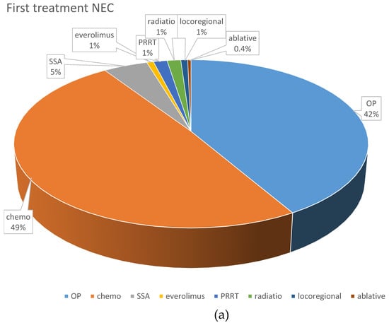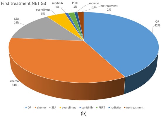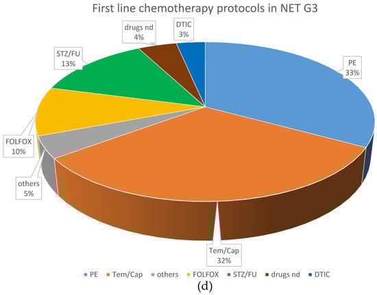 Distribution of first-line treatments in patients classified as NEC or NET. (a) First-line NEC, all treatments. (b) First-line NET G3, all treatments. (c) First-line chemotherapeutic protocols in NEC. (d) First-line chemotherapeutic protocols in NET G3. Ablative: local ablative treatment such as radiofrequency ablation or microwave ablation; carbo mono: monotherapy with carboplatin; carbo/tax: carboplatin + paclitaxel; chemo: chemotherapy; DTIC: dacarbazine; drugs nd: chemotherapy protocol not documented; EP: platinum + etoposide; FOLFOX: oxaliplatin + 5-fluorouracil; OP: operative treatment; others: sum of other regimens used in less than 1% of patients; PRRT: peptide receptor radionuclide treatment; SSA: somatostatin analog; STZ/FU: streptozocin+ 5-fluorouracil; Tem/Cap: temozolomide + capecitabine.