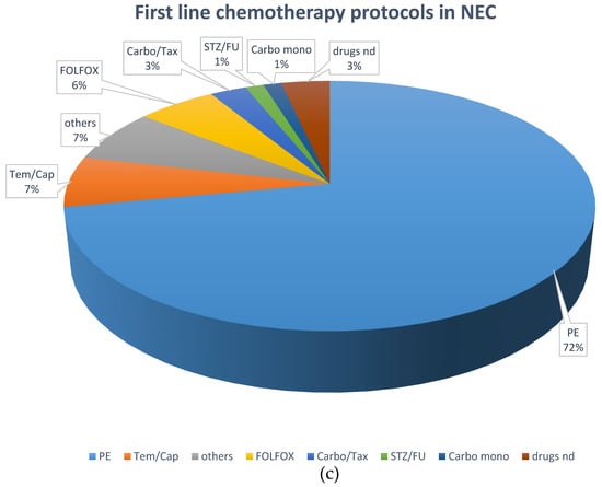 Systemic chemotherapy was the most frequently applied first-line treatment (195 patients; 43.8%). Cis- or carboplatin plus etoposide was the most frequently used first-line protocol, given in 102 NEC patients (74.5%) and 11 NET G3 patients (26.2%). Fourteen NET G3 patients (33.3%) received a combination of temozolomide and capecitabine, six received FOLFOX (14.2%), and five NET G3 patients (11.9%) received streptozocin and 5FU as first-line chemotherapy, respectively. Other first line treatments comprised somatostatin analogs (n = 33, 7.4%), local radiotherapy (n = 8, 1.8%), everolimus (n = 7; 1.6%) and PRRT (n = 6; 1.4%).