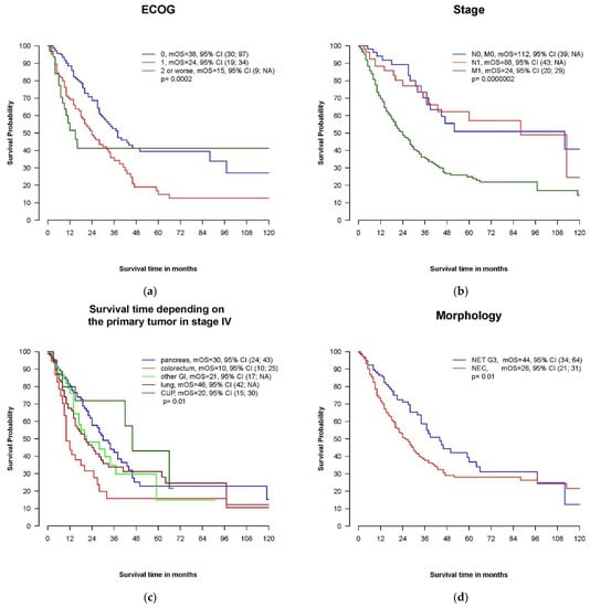 The median OS in patients with cancer classified as NEC was 26 months and shorter compared to NET G3 (mOS 44 months, p = 0.01) (Figure 3d). This was also true for patients initially diagnosed with metastatic disease: mOS in stage IV NET G3 and NEC was 34 months and 20 months, respectively (p = 0.01).