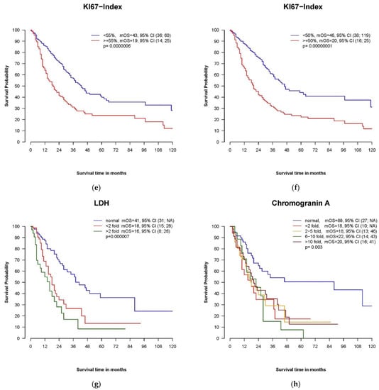 As demonstrated in Figure 3g,h, elevated baseline values for LDH and CgA were prognostically unfavorable. A normal level of LDH was associated with longer OS (41 months), whereas mOS was 18, 16 and 2 months in patients with LDH levels elevated < twice the upper limit of normal, 2-< 5 times the upper limit of normal and >5 times the upper limit of normal, respectively (p = 0.015). NSE was available in 138 cases at baseline, and only marked elevations >10-fold the upper limit of normal were associated with poor outcomes (mOS 9 months).