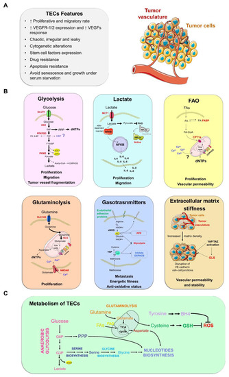 Overview of tumor endothelial cell (TEC) metabolism. (A) Phenotypically, TECs show a high replication rate coupled to invasiveness, over-expression of receptors, and pro-angiogenic growth factors such as the vascular endothelial growth factor/vascular endothelial growth factor receptor 2 (VEGF/VEGFR2) axis, cytogenetic alterations, stemness and chemotherapy resistance, the ability to grow in serum-free media, and reduced senescence and apoptosis. (B) The main metabolic pathways reported so far in the remodeling of endothelial cell metabolism in cancer context. Proliferating TECs strongly depend on glycolysis and glucose uptake to produce adenosine triphosphate (ATP). Glycolysis provides the energy necessary to guide TEC proliferation and migration; lactate present in tumor microenvironment is imported into TECs through monocarboxylate transporter 1 (MCT-1) and can fuel vessel sprouting by two ways. By activating the nuclear factor kappa-light-chain-enhancer of activated B cells (NF-kB) pathway that up-regulates interleukin 8 (IL-8) and leads to the IL-8 self-stimulation, or by converting into pyruvate that inhibits prolyl hydroxylase (PHD2) activating hypoxia-inducible factor 1 alpha (HIF1α); Fatty acids oxidation (FAO) provides intermediate metabolites and biomass to support sprouting vessels. The EC-specific deletion of both carnitine palmitoyltransferase 1a and 2 (CPT1a and CPT2, respectively), genes that regulate the carnitine shuttle, cause vessel leakage; gasotransmitters such as hydrogen sulfide (H2S) and nitric oxide (NO) play a pleiotropic role by altering the proteome of cells and their pro-angiogenic action affects metabolism; extracellular matrix stiffness promotes tumor vessels formation by yes-associated protein (YAP)/transcriptional coactivator with PDZ-binding motif (TAZ) activation and leads to angiogenesis. The enzymes/transporters directly involved in tumor angiogenesis are highlighted in red. (C) Metabolic interaction within individual pathways in TECs. The Figure was partly generated using Servier Medical Art.Servier Medical Art by Servier is licensed under a Creative Commons Attribution 3.0 Unported License (https://creativecommons.org/licenses/by/3.0/, accessed on 30 March 2022). ↑: High. GLUT1: glucose transporter 1; HK2: hexokinase 2; PPP: pentose phosphate pathway; HBP: hexosamine biosynthetic pathway; G6P: glucose-6-phosphate; PFKFB3: 6-phosphofructo-2-kinase/fructose-2,6-biphosphatase 3; F2,6-BP: Fructose 2,6-bisphosphate; F6P: fructose 6-phosphate; F1,6-BP: fructose 1,6-bisphosphate; OXPHOS: oxidative phosphorylation; FAs: fatty acids; FABP: fatty acid binding protein; TCA cycle: tricaboxylic cycle; dNTPs: deoxyribonucleoside triphosphates; SLC1A5: solute carrier family 1 member 5; GLS: glutaminase; NMDAR: N-methyl-D-aspartate receptor; eNOS: endothelial nitric oxide synthase; ROS: reactive oxygen species; BH4: tetrahydrobiopterin; GSH: glutathione.