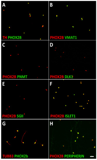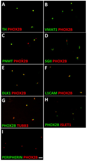 Sympathetic neuroblasts were obtained by dissociating E14.5 embryonic mouse sympathetic ganglia (SCG, STG, and thoracic sympathetic chain ganglia). At this stage of development, the vast majority of ganglion cells are proliferating PHOX2B+/TH+/TUBB3+/PERIPHERIN+ neuroblasts [59]. Using co-immunostaining with PHOX2B, the sympathetic neuroblasts were shown to express adrenergic- (TH, VMAT1) and pan-neuronal- (TUBB3, ISL1, PERIPHERIN) but not chromaffin cell-specific proteins (PNMT, DLK1, SGII) (Figure 1).