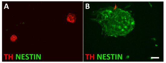 Characterization of sphere cultures from L1CAM-positive and L1CAM-negative cells. L1CAM-positive spheres are composed of TH-expressing cells (A), whereas L1CAM-negative spheres are largely composed of NESTIN-positive cells (B). Magnification bar, 60 μm.
