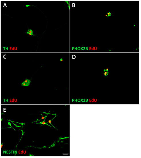 Substrate-attached rather than sphere cultures were used to allow the unambiguous identification and quantification of individual immunostained cells. Proliferating chromaffin-like cells and sympathetic neuroblasts were identified by a 4-h EdU pulse and co-staining for PHOX2B and EdU (Figure 5). The percentage of proliferating NESTIN-expressing cells was determined by co-staining for NESTIN and EdU (Figure 5).