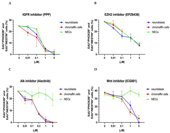 Effect of IGF, EZH2, ALK, and WNT inhibitors on the proliferation of chromaffin cells, neuroblasts, and NESTIN-expressing cells (NECs). Dose–response curves are shown for IGFR inhibitor (PPP) (A), EZH2 inhibitor (EPZ6438) (B), Alk inhibitor (Alectinib), (C) and Wnt inhibitor (ICG001) (D). Data represent the mean ± s. e. m. of at least three independent experiments.