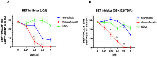 We next evaluated the effect of the BET inhibitor JQ1. Interestingly, the neuroblasts, chromaffin cells, and NESTIN-expressing cells differed significantly in their response to JQ1 treatment (Figure 7A). While the proliferation of the NESTIN-expressing cells was unaffected, the chromaffin cells showed a sensitivity to JQ1 inhibition that was ten-fold higher compared to that of the neuroblasts (Figure 7A). The difference in the sensitivity to BET inhibition was even stronger in response to a second BET inhibitor (GSK1324726A/I-BET726) (Figure 7B).