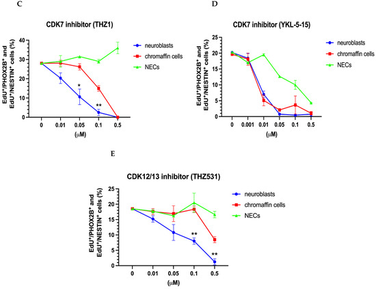 Subsequently, we explored the effects of various CDK inhibitors. THZ1 showed differential effects with stronger neuroblast inhibition compared to chromaffin cell proliferation (Figure 7C). While THZ1 appears to preferentially affect genes controlled by super-enhancers in neuroblastoma, MYCN-dependent genes in particular [44,72], there is evidence to indicate that the off-target inhibition of CDK12 and CDK13 rather than of CDK7 is responsible for the transcriptional effects of THZ1 [72]. To address this issue, we further studied the effects of the selective CDK7 inhibitor YKL-5-124 and the CDK12/13 inhibitor THZ531. Differential effects on neuroblast and chromaffin cell proliferation were observed in response to THZ531 but not YKL-5-125 (Figure 7D,E), which is in agreement with the conclusion that differential THZ1 effects involve CDK12/CDK13 in addition to CDK7 inhibition [72].