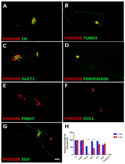 We observed that a small subpopulation of cells displayed a neuronal phenotype with long neurites after the 6-day-culture period (Figure 8A,B). The neuronal markers that were expressed in the short-term cultures were maintained (TUBB3, ISL1) (Figure 8B,C,H). In parallel, PNMT expression was completely lost (Figure 8E,H), and the expression levels of other chromaffin cell markers were decreased (Figure 8F,G), resulting in a lower percentage of PHOX2B-positive cells expressing DLK1 (44 ± 9%) and SGII (70 ± 12%) compared to chromaffin cells after short-term culture (DLK1 91 ± 4%; SGII 92 ± 4%; PNMT 57 ± 3%) (Figure 8H). The percentage of PHOX2B-positive cells expressing TH and CHGB did not change between 1 and 6 days in culture (97% vs. 100%; 92% vs. 94%). Taken together, our present results reveal partial chromaffin cell dedifferentiation rather than full transdifferentiation to a neuronal identity.