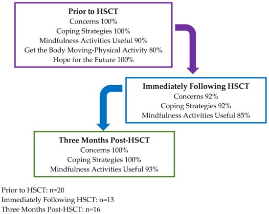 At each timepoint (prior to, immediately after, and three months post HSCT), three themes related to mindfulness, preferences, and unmet needs were derived from the semi-structured interview transcripts, including “Concerns”, “Coping Strategies” and “Mindfulness Activities”. In addition to these themes across each timepoint, timepoint 1 (prior to HSCT) had two additional themes occur, including “Hope for the Future” and “Getting the Body Moving-Physical Activity”. Headlines for the themes are presented in Figure 1.