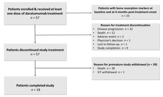 The primary efficacy population included all eligible patients who received at least one dose of daratumumab and had available results for bone resorption markers at baseline and at 4 months post-treatment initiation. The full analysis set included all eligible patients who received at least one dose of daratumumab. Efficacy analyses were performed in the primary efficacy population (i.e., all eligible patients who received at least one daratumumab dose and had available results for bone resorption markers at baseline and at 4 months post-treatment onset). The statistical analysis was performed using SAS® statistical analysis software (v. 9.4) (SAS Institute, Cary, NC, USA). Summary statistics are presented for categorical variables based on frequency tables. Regarding continuous variables, descriptive statistics (median, Q1, Q3, values) were used. The Kaplan-Meier method was applied for all time to event analyses. To further evaluate the changes in biomarkers over time until 12 months post-treatment onset, linear repeated measures models were fitted. In the final model, visit (i.e., cycle) was included as a fixed effect and the log-transformed absolute biomarker values at each timepoint were considered as dependent variables.