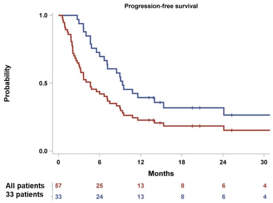 Kaplan–Meier curves of PFS for the enrolled patients (n = 57) and the primary analysis cohort (n = 33).