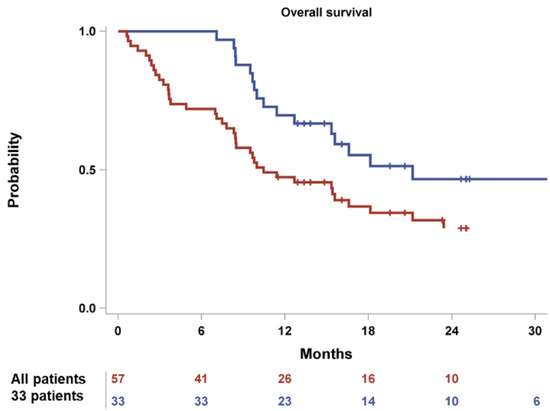 Kaplan–Meier curves of OS for the enrolled patients (n = 57) and the primary analysis cohort (n = 33).