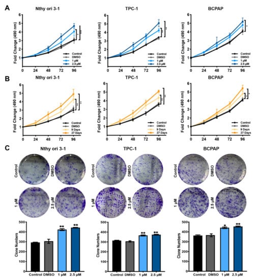 Hormesis effect of BDE209 on Nthy-ori 3-1 and PTC cell proliferation. (A) Cell viability in the indicated cell lines and concentration was assessed by MTS assays, and the results were calibrated to time 0. (B) Cell viability was measured in the indicated cell lines under decabromodiphenyl ether (BDE209) treatment by MTS assays. Nthy-ori 3-1, TPC-1, and BCPAP cells were treated with 2.5 μM BDE209 for 9 and 27 days. The DMSO group of each cell line was treated with DMSO at a concentration of 2.5 μM for 27 days. (C) Colony formation assay of the indicated cells treated with BDE209 or DMSO. * p < 0.05, ** p < 0.01, *** p < 0.001 based on Student’s t-test. The data shown are the means ± SD of triplicate wells and are representative of at least three replicate experiments.