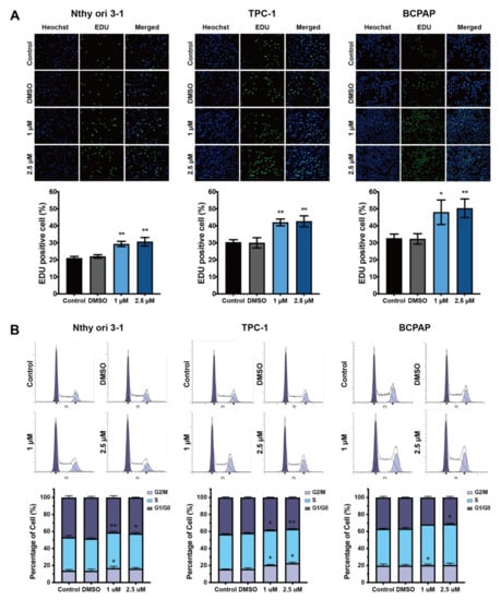 Cell cycle analysis of Nthy-ori 3-1 and PTC cells after exposure to BDE209 (1 and 2.5 μM). (A) Representative images (top panel) and quantitative results (bottom panel) of EdU assays of Nthy-ori 3-1, TPC-1 and BCPAP cells. (B) Percentages of the cells in the cycle phase of the flow cytometry analysis after treatment with BDE209 or DMSO. * p < 0.05; ** p < 0.01. Each experiment was repeated at least three times.