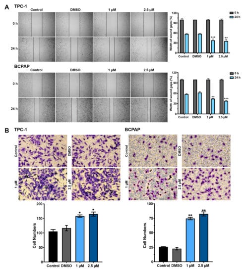 We next investigated the migratory properties of BDE209-treated PTC cells using wound-healing assays (Figure 3A). The mobility of the carcinoma cells was significantly accelerated with environmentally relevant doses of BDE209 exposure as compared to the control and DMSO groups. Moreover, the Transwell system further confirmed the effects of BDE209 on TPC-1 and BCPAP cell migration and invasion. As shown in Figure 3B, BDE209 at 1 μM and 2.5 μM significantly increased the quantity of invading cells compared to the control. These results indicated that BDE209 promoted both the migration and invasion of PTC cancer cells.