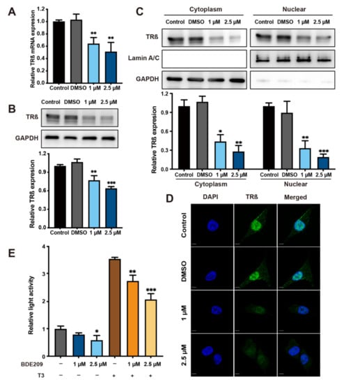 The chemical structure of BDE209 closely resembles that of T3 and T4 and hydroxylated metabolites of BDE209 bind with high affinity to thyroid hormone receptors (TRs). We therefore wondered whether BDE209 treatment alters the thyroid system through hormone mimicry in human thyroid follicular epithelial cells. Thus, the expression of TRß in Nthy-ori 3-1 cells was detected after exposure to different concentrations of BDE209. As shown in Figure 4A,B and Figure S2, an environmentally relevant concentration of BDE209 decreased the mRNA and protein levels of TRß compared to the control and DMSO groups, and the levels of TRß decreased in a dose-dependent manner. To determine which subcellular localization of TRß is responsible for BDE209, we applied immunoblotting analysis. We observed that TRß could be expressed in both cytoplasmic and nuclear fractions of cells. However, the levels of both cytoplasmic and nuclear TRß were decreased when Nthy-ori 3-1 cells were treated with BDE209 for 27 days (Figure 4C and Figure S2). Consistent with our findings, in IF assays, TRß was expressed at low levels when the cells were treated with 1 μM and 2.5 μM BDE209 compared to the control groups (Figure 4D). TRs are DNA-binding transcription factors that recognize specific and highly conserved DNA sequences called TRE in the promoters of T3 target genes. We determined the effect of BDE209 on TRß-mediated transcription in 293T cells using a transient transfection-based dual-luciferase reporter gene assay. Our data showed that BDE209 suppressed TRβ-mediated transcription of TRE and significantly altered the transcription levels when T3 was present (Figure 4E and Figure S1B). These results suggest that there may be competitive inhibition between BDE209 and T3 at multiple levels.