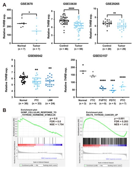Inverse association between TRß expression and thyroid cancer. (A) Relationship between THRB and clinical outcomes. Thyroid tumours in GSE3678, GSE33630, GSE29265 and GSE60542 were analysed. * p < 0.05, ** p < 0.01, *** p < 0.001 and **** p < 0.0001. PTC, papillary thyroid carcinoma; LNM, lymph node metastasis; FTC, follicular thyroid carcinoma; FVPTC, follicular variant papillary thyroid carcinoma; PDTC, poorly differentiated thyroid carcinoma. (B) The enrichment of the indicated gene sets by GSEA.