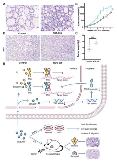 BDE209 promotes the proliferation of thyroid follicular cells and BCPAP cells in BALB/c female mouse xenograft models. (A) Mice bearing BCPAP xenografts were treated with control (peanut oil p.o.) or high dose BDE209 (2000 µg/(kg/d) p.o.) for 4 weeks (n = 5/group). Proliferative thyroid follicles with an increased number of follicular cells were observed in the BDE209 group compared with the control group. Scale bars, 50 μm. (B) Tumour volumes with or without BDE209 exposure were measured twice per week. (C) Tumours were collected and weighed when the mice were sacrificed. (D) Immunohistochemical staining of the tumours with or without BDE209 exposure is shown. Scale bars, 50 μm. (E) Working model of long-term exposure to decabromodiphenyl ether promotes the proliferation and tumourigenesis of papillary thyroid carcinoma by inhibiting TRß. ** p < 0.01, *** p < 0.001, based on Student’s t-test. Each experiment was repeated at least three times.