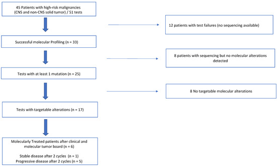 - Khater, F.; Vairy, S.; Langlois, S.; Dumoucel, S.; Sontag, T.; St-Onge, P.; Bittencourt, H.; Soglio, D.D.; Champagne, J.; Duval, M.; et al. Molecular Profiling of Hard-to-Treat Childhood and Adolescent Cancers. JAMA Netw. Open 2019, 2, e192906. [Google Scholar] [CrossRef]