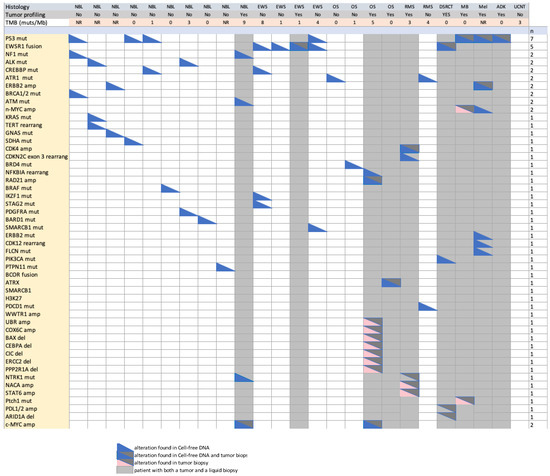 Oncoplot of molecular alteration and TMN found in liquid biopsies and tumor biopsies. Abbreviations used: TMB, tumor mutational burden; amp, amplification; rearrang, rearrangement; NR, not reported in LB results. NBL: neuroblastoma; EWS: Ewing sarcoma, OS: osteosarcoma; RMS: rhabdomyosarcoma; MB: medulloblastoma; DSCRT: desmoplastic small round cell tumor; Mel: melanoma; ADK: adenocarcinoma; UCNT: undifferentiated carcinoma of the nasopharynx.