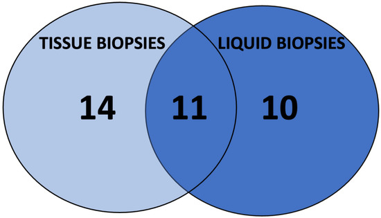 Data from patients who underwent paired tissue and liquid tumor biopsies were collected. Nine patients were identified. The data have been included in Figure 2. Furthermore, as shown with a Venn diagram (Figure 3), a 31% overlap with 11 alterations in common between tumor and plasma was found. Besides, 10 molecular alterations were found on LB only and 14 on tissue biopsies only.