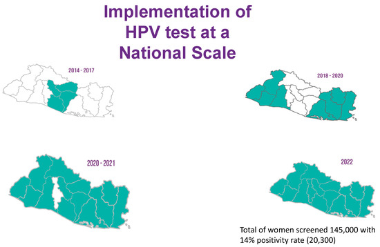 - Cremer, M.; Maza, M.; Alfaro, K.; Velado, M.M.; Felix, J.; Castle, P.E.; Kim, J.; Gage, J.C. Scale-up of an human papillomavirus testing implementation program in El Salvador. J. Low. Genit. Tract Dis. 2017, 21, 26–32. [Google Scholar] [CrossRef] [PubMed][Green Version]