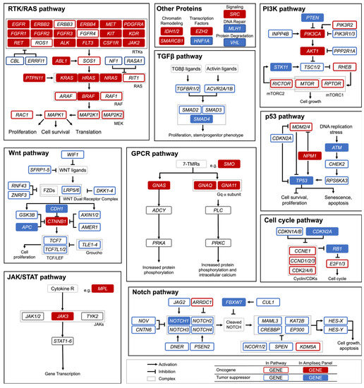 Signaling Pathways with Cancer Critical Genes. Hotspot panel genes in this study are shaded in red (oncogenes), and blue (tumor suppressor genes). RTK: Receptor Tyrosine Kinase; RAS: Rat Sarcoma; TGFβ: Transforming Growth Factor Beta; PI3K: Phosphoinositide 3-kinase; GPCR: G-Protein Coupled Receptor; JAK: Janus Kinase; STAT: Signal Transducer and Activator of Transcription Proteins. Figure modified from Sanchez-Vega et al. [6].