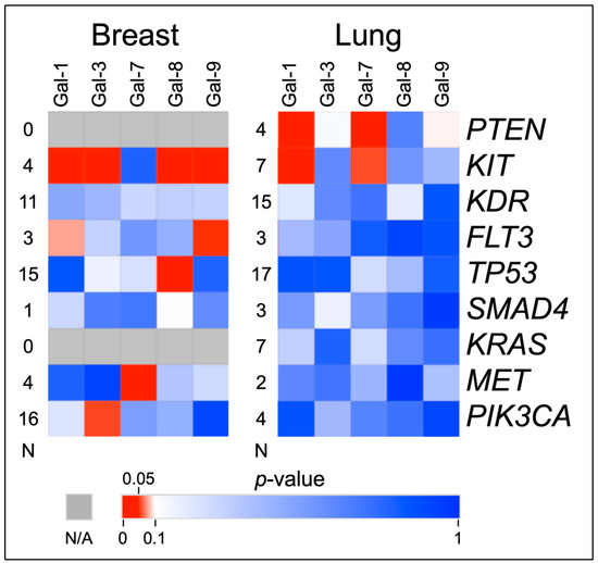 Heat Map of Mutated versus Wild-Type Galectin Levels T-Tests. This figure shows the p-values of t-test comparisons of the serum galectin levels in mutated vs. non-mutated genes in breast and lung cancer patients. Levels of galectin-1, -3, -8, and -9 are significantly elevated when KIT is mutated in breast cancer samples. Levels of galectin-1 and -7 are significantly elevated when PTEN and KIT are mutated in lung cancer samples. “N” indicates the number of mutated samples in the comparison.