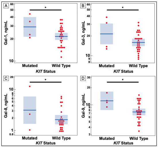 Comparison of Serum Galectin Levels of Breast Cancer Patients KIT Gene Mutation Status in Tumor Sample. (A) Serum levels of galectin-1, as determined by ELISA, were significantly higher in breast cancer patients with a mutation in the KIT gene. (B) Serum levels of galectin-3, as determined by ELISA, were significantly higher in breast cancer patients with a mutation in the KIT gene. (C) Serum levels of galectin-8, as determined by ELISA, were significantly higher in breast cancer patients with a mutation in the KIT gene. (D) Serum levels of galectin-9, as determined by ELISA, were significantly higher in breast cancer patients with a mutation in the KIT gene. (* p-value ≤ 0.05).