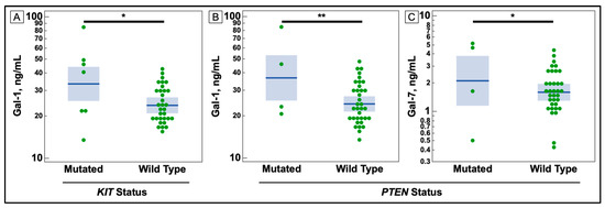 Comparison of Serum Galectin Levels of Non-small Cell Lung Cancer Patients with KIT and PTEN Mutations in Tumor Sample. (A) Serum levels of galectin-1, as determined by ELISA, were significantly higher in non-small cell lung cancer patients with a mutation in the KIT gene. (B,C) Serum levels of galectins -1, and -7 were elevated in patients with a mutation in the PTEN gene. (* p-value ≤ 0.05, ** ≤ 0.01).