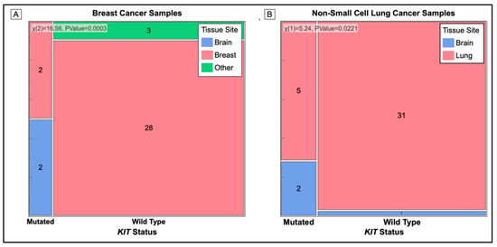Mosaic Plot of Cancer Tissue Biopsy Site (Primary and Metastatic) used for Mutation Analysis. Cell sizes are proportional to the number of samples in that category. Mutation status is on the X-axis and color represents the tissue sample of origin. (A) All KIT mutations occur in biopsy samples of breast cancer taken from the brain. The p-value = 0.0003. (B) Biopsy samples taken from the brain have a higher number of KIT mutations than samples from the lung. The p-value = 0.0221.