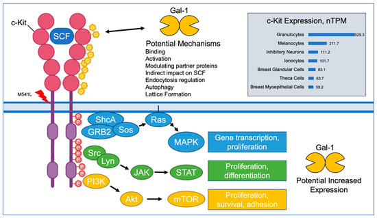 Galectins and RTKs, such as c-Kit, are known to have an abundant number of interactions [104]. There is no literature to indicate specific interactions between galectins -1, -3, -8, and -9 and c-Kit, although it is known that galectins do interact with other members of this class of RTKs, such as platelet-derived growth factor receptor (PDGFR) via spatial organization and trafficking [105,106,107].