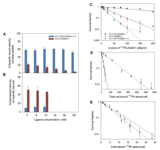 (A) Specific bound (% of total added activity) and (B) internalized activity (% of specific bound activity) of 212Pb-NG001 at variable ligand concentrations in C4-2 and PC-3 PIP cells, n = 3–5. (C) Survival fraction of PC-3 Flu, C4-2, and PC-3 PIP cells after 1 h treatment with 212Pb-NG001 (mean ± SD, n = 2–3) compared to untreated control cells. Survival fraction of C4-2 and PC-3 PIP cells at variable number of (D) bound and (E) internalized 212Pb atoms/cell. The cell survival curves (C) were fitted by using SigmaPlot 14.5 software by the single-hit model (solid line, equation: SF = exp(−A/A0)), where SF is survival fraction, A is the activity (kBq/mL), and A0 is the activity to reduce survival by 67%; dotted line, experimental data. The cell survival data (D,E) were fitted with single exponential functions.