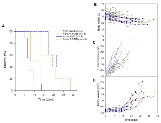 (A) Survival, (B) body weight and (C,D) tumor growth of NSG and athymic nude mice bearing human prostate PC-3 PIP tumors treated with (C) saline or (D) 0.3 MBq of 212Pb-NG001. Survival was estimated by Kaplan–Meier survival analysis followed by log-rank test by pairwise comparisons. n, number of mice per group.