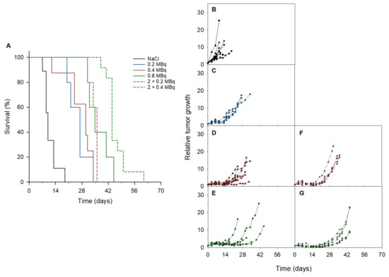 (A) Survival and (B–G) relative tumor growth of PC-3 PIP xenografts treated with (B) saline (n = 9), (C) 0.2 (n = 5), (D) 0.4 (n = 8), (E) 0.8 (n = 5), (F) 2 × 0.2 (n = 5) or (G) 2 × 0.4 (n = 12) MBq of 212Pb-NG001. Survival was estimated by Kaplan–Meier survival analysis followed by a log-rank test with multiple pairwise comparisons (Holm–Sidak). Each line in (B–G) represents the largest tumor from each mouse.
