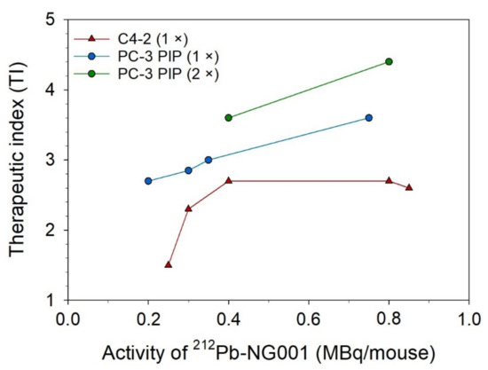 In vitro cytotoxicity and in vivo therapeutic efficacy of 212Pb-NG001 was less than 1.8-fold better for the PC-3 PIP model than for the C4-2 model (Figure 1 and Figure 4 and Table 1), even though PSMA expression is 10–20-fold higher on the surface of PC-3 PIP cells than on C4-2 cells [35]. This discrepancy between the cellular PSMA expression and therapeutic efficacy can be explained by factors including internalization of the radioligand and tumor microenvironment.