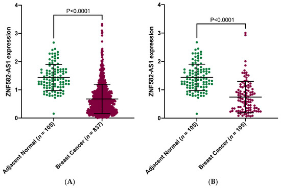 Comparison of ZNF582-AS1 expression between breast cancer and adjacent normal tissues. (A) ZNF582-AS1 expression in breast cancer (n = 837) and adjacent breast tissues (n = 105). (B) ZNF582-AS1 expression in matched breast cancer (n = 105) and adjacent breast tissues (n = 105).