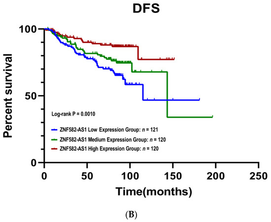 Kaplan–Meier survival curves by ZNF582-AS1 expression in tertile. (A) Overall survival (OS) curves by high, mid, and low expression of ZNF582-AS1. (B) Disease-free survival (DFS) curves by high, mid, and low expression of ZNF582-AS1.
