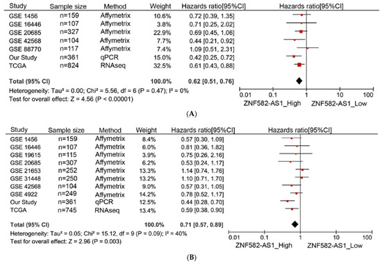 A meta-analysis was performed to examine the association between ZNF582-AS1 expression and breast cancer survival in nine GEO datasets, the TCGA data, and our own study. In total, 7 datasets had information on overall survival in 1999 patients, and 10 datasets had information on disease-free survival in 2649 patients. Most of the studies showed a similar direction of associations between breast cancer survival and ZNF582-AS1 expression (Figure 3A,B). The summary results indicated that both overall and disease-free survival were significantly associated with ZNF582-AS1 expression. Compared to those with low expression, patients with high expression had a lower risk of death (HR = 0.62, 95%CI: 0.51–0.76) and relapse (HR = 0.71, 95%CI: 0.57–0.89). These results did not change substantially when only GEO datasets were included in the analysis (data not shown).