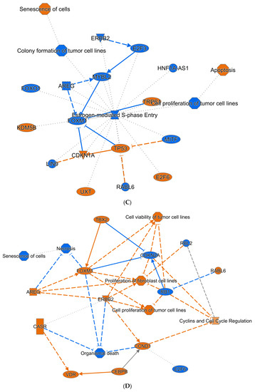Using IPA, we interrogated the signatures of ZNF582-AS1 expression and methylation and found complementary results between the signatures. Both signatures showed similar molecular and cellular functions in four of the top five predictions, namely (1) cell cycle; (2) cellular assembly and organization; (3) DNA replication, recombination, and repair; and (4) cell death and survival (Figure 4A,B). The expression signature suggested the upregulation of ERBB2, AREG, FOXM1, and RABL6 and downregulation of E2F6, whereas methylation signature showed opposite effects on these molecules (Figure 4C,D). Furthermore, the expression signature was linked to the suppression of tumor cell proliferation and colony formation, and promotion of cell apoptosis and senescence, whereas the methylation signature indicated promotion of tumor cell proliferation and viability, and suppression of cell death and senescence (Figure 4C,D).
