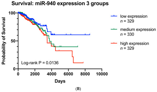 Analysis of hsa-miR-940 expression in breast cancer and adjacent normal breast tissues (n = 105), as well as its expression in association with overall survival in TCGA. (A) Comparison of hsa-miR-940 expression between breast cancer and match adjacent normal tissues (n = 105). (B) Kaplan–Meier overall survival (OS) curves by high, mid, and low expression of hsa-miR-940.
