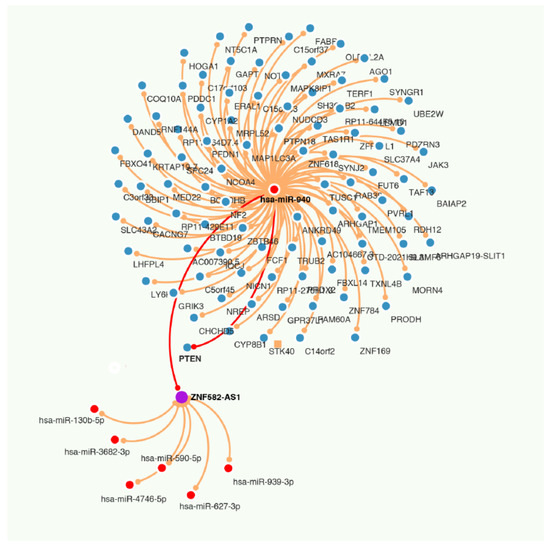 To evaluate the involvement of hsa-miR-940 in breast cancer, we compared hsa-miR-940 expression between breast cancer and adjacent normal tissues in 105 TCGA samples (Figure 5A) and found higher expression in breast cancer than in normal tissues (7.09 vs. 1.40; p = 3.05 × 10 −10). The relationship between hsa-miR-940 expression and overall survival was analyzed in 988 breast cancer patients after hsa-miR-940 expressions were grouped into three categories based on the tertile distribution (high, medium, and low). Patients with a high expression had poor survival when compared to those with a low expression (p = 0.0136) (Figure 5B), suggesting that hsa-miR-940 may negatively impact breast cancer survival, an effect opposite to that of ZNF582-AS1. A predicted RNA network among lncRNA ZNF582-AS1, miRNA has-miR-940, and mRNA PTEN is shown in Figure 6.