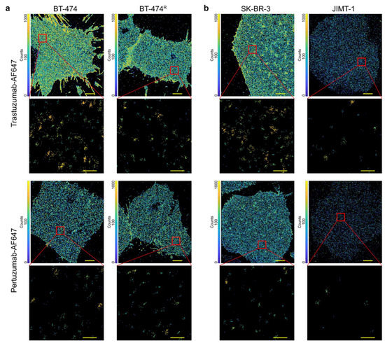 SMLM images of HER2 detected in cultured breast cancer cell lines. (a). HER2 was detected using trastuzumab-AF647 (top) or pertuzumab-AF647 (bottom) in luminal B breast cancer cells BT-474 (trastuzumab-sensitive) and BT-474R (trastuzumab-resistant). (b). HER2 was detected using trastuzumab-AF647 (top) or pertuzumab-AF647 (bottom) in HER2-overexpressing breast cancer cells SK-BR-3 (trastuzumab-sensitive) and JIMT-1 (trastuzumab-resistant). The localizations are colored based on the number of neighboring localizations within 70 nm (purple is least clustered and yellow is most clustered). Scale bars are 5 µm for full cells and 200 nm for insets. While the figure shows representative images, measurements were repeated three independent times, and 14–15 cells were imaged in each case.