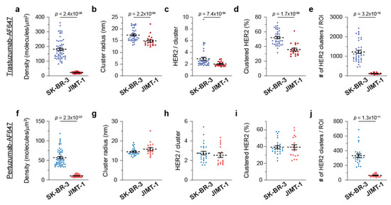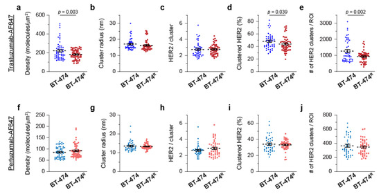 Quantitative information on HER2 density and distribution at the plasma membrane was obtained from three independent measurements with sufficient cell sampling (in four cell lines, the p-valuesplit [97] for all measured variables with both probes was above 0.1). When trastuzumab was used as a probe, quantitative analysis of SMLM data revealed substantial differences between trastuzumab-sensitive BT-474 cells and trastuzumab-resistant BT-474R cells. The average detected HER2 density in BT-474 cells was significantly higher compared to BT-474R cells (221 vs. 182 molecules/µm2, Figure 2a and Supplementary Tables S1a and S2); BT-474 cells also had a higher coefficient of variation for the detected densities (43 vs. 28%). Additionally, the two cell lines exhibited differences in HER2 nano-organization. While the cluster radii (17.1 and 16. 3 nm) and average number of HER2 molecules in a cluster (2.7 and 2.8) were similar between the two cell lines (Figure 2b,c and Supplementary Tables S1a and S2), both the number of HER2 clusters per ROI and the fraction of clustered HER2 molecules were significantly higher in BT-474 cells compared to BT-474R cells (Figure 2d,e and Supplementary Tables S1a and S2). On average, BT-474 cells had 1264 clusters per ROI and 48% of HER2 molecules were in these clusters; BT-474R cells had 928 clusters per ROI and 44% of HER2 molecules were in these clusters. Interestingly, when pertuzumab was used as a probe, we did not observe significant differences between the two cell lines in terms of either detected HER2 densities or nano-organization (Figure 2f–j and Supplementary Tables S1a and S2). Accordingly, we observed substantial differences between trastuzumab and pertuzumab detection. In both cell lines, detection with pertuzumab resulted in a significantly lower detected HER2 density, a smaller HER2 cluster radius, a lower fraction of clustered HER2, and a smaller number of detected HER2 clusters (Figure 2 and Supplementary Tables S1a and S2).