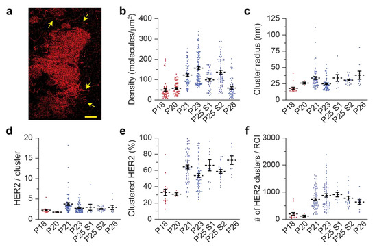 A SMLM image for a biopsied HER2-positive cancer cell is shown in Figure 4a. Representative SMLM images for each individual woman are shown in Supplementary Figure S5. Although most cells had relatively uniform distributions of HER2, a few (e.g., P21 and P26, Supplementary Figure S5) had noticeable non-uniform densities. Interestingly, HER2-enriched cell protrusions were also observed in some cells (Figure 4a, indicated by arrows). This is consistent with previous reports of HER2 enrichment in membrane protrusions [114]. The average detected HER2 densities in these women ranged from 49 to 157 molecules/µm2. The lowest values were observed in patients P18 (RCB-I), P20 (RCB-II), and P26 (pCR with DCIS): 49, 58, and 59 molecules/µm2, respectively (Figure 4b and Supplementary Table S4). Interestingly, these three women also had the largest coefficients of variations for detected HER2 densities. The two regions taken from the P25 biopsy sample had significantly different densities (99 and 137 molecules/µm2), indicating that HER2 expression was different at the two tumor sites. There was no association between the heterogeneity in detected densities and the clinical response (Supplementary Table S4).